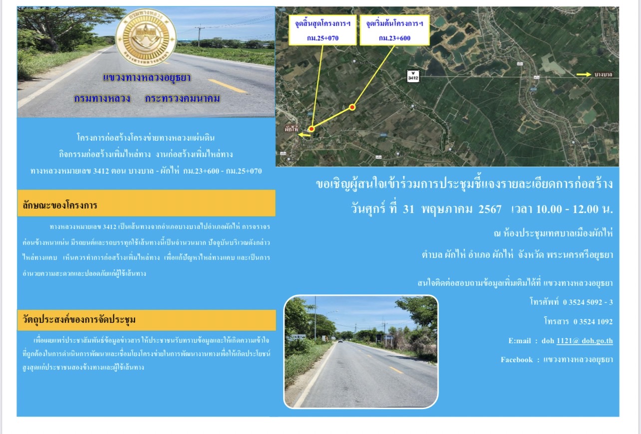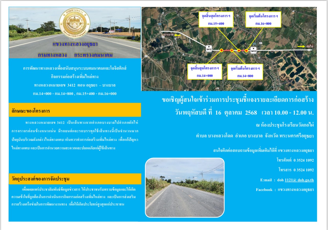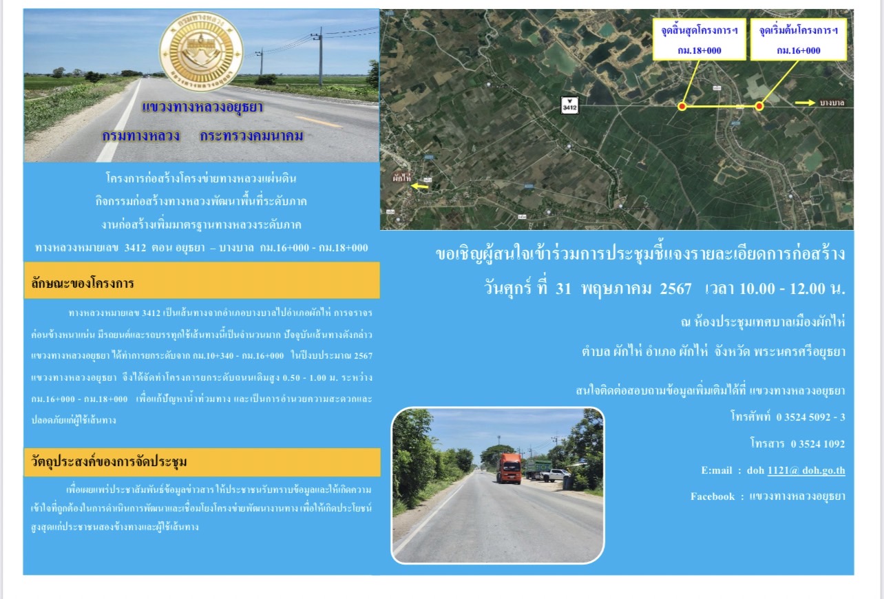 15 23/05/2567 โครงการก่อสร้างโครงข่ายทางหลวงแผ่นดิน กิจกรรมก่อสร้างทางหลวงพัฒนาพื้นที่ระดับภาค งานก่อสร้างเพิ่มมาตรฐานทางหลวงระดับภาค ทางหลวงหมายเลข 3412 ตอน อยุธยา - บางบาล กม.16+000 - กม.18+000