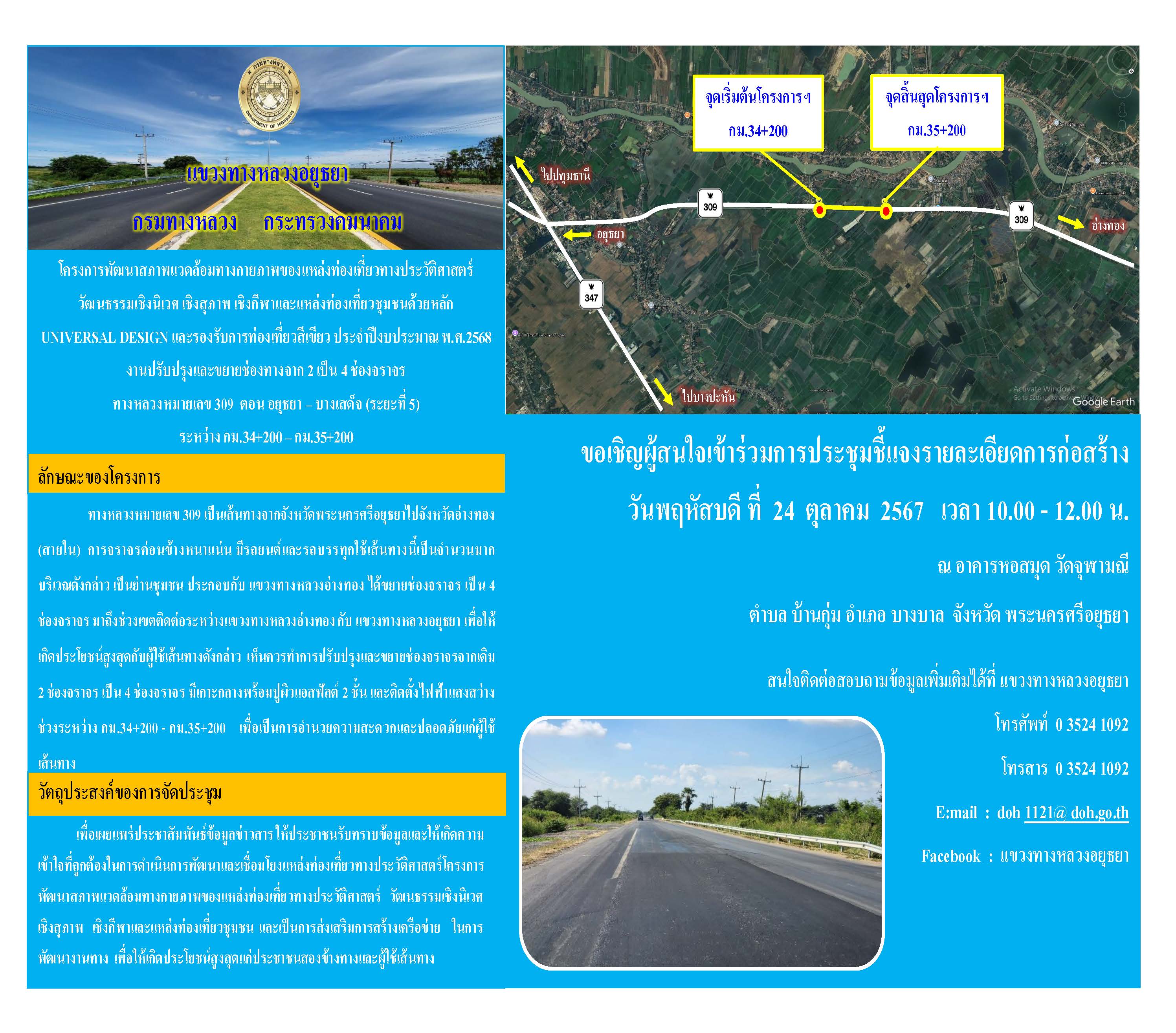 13 23/10/2567 โครงการพัฒนาสภาพแวดล้อมทางกายภาพของแหล่งท่องเที่ยวทางประวัติศาสตร์ วัฒนธรรมเชิงนิเวศ เชิงสุภาพ เชิงกีฬาและแหล่งท่องเที่ยวชุมชนด้วยหลัก UNIVERSAL DESIGN และรองรับการท่องเที่ยวสีเขียว ประจำปี งบประมาณ พ.ศ.2568 งานปรับปรุงและขยายช่องทางจาก 2 เป็น 4 ช่องจราจร ทางหลวงหมายเลข 309 ตอน อยธุยา – บางเสด็จ (ระยะที่ 5) ระหว่าง กม.34+200 –กม.35+200