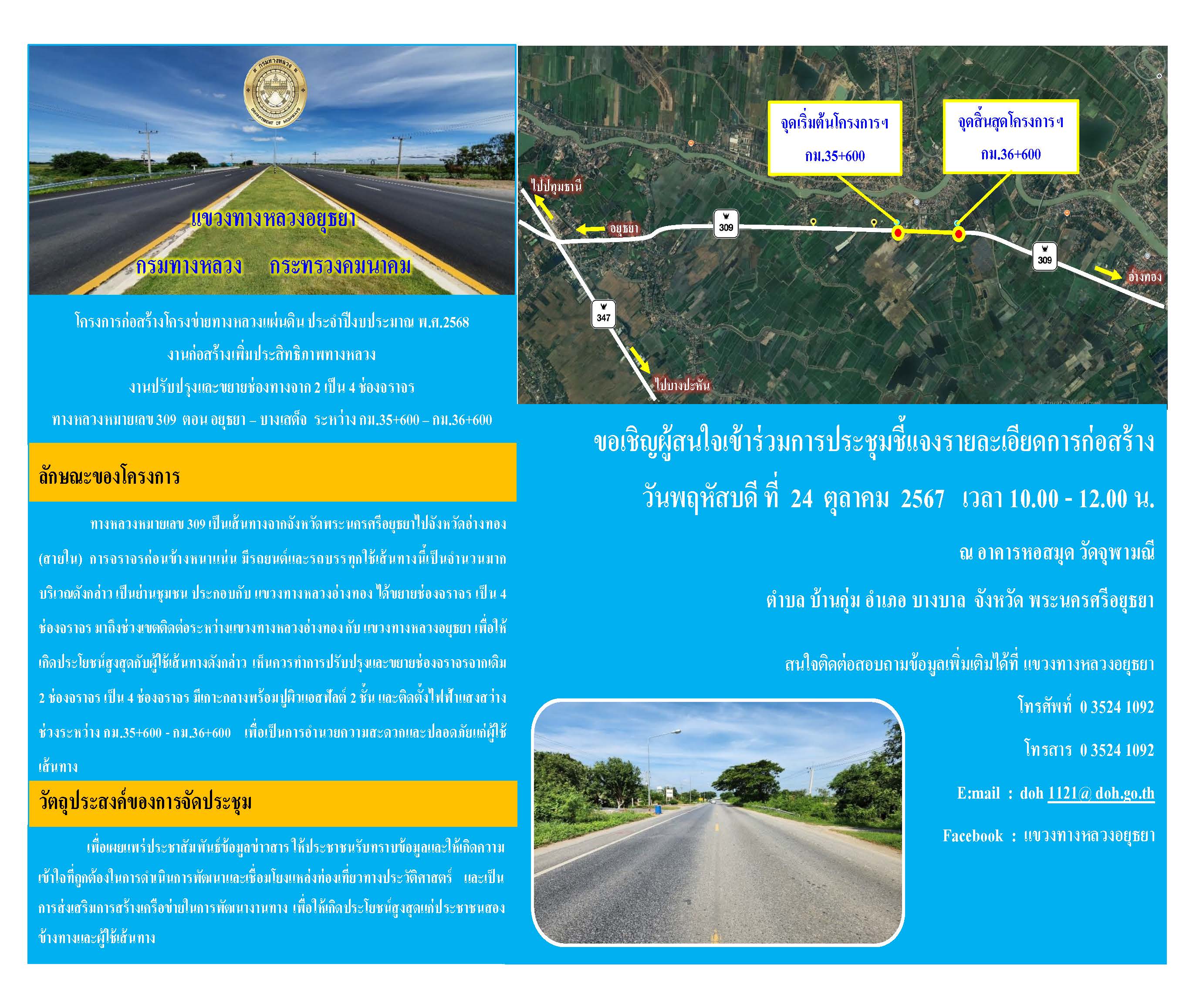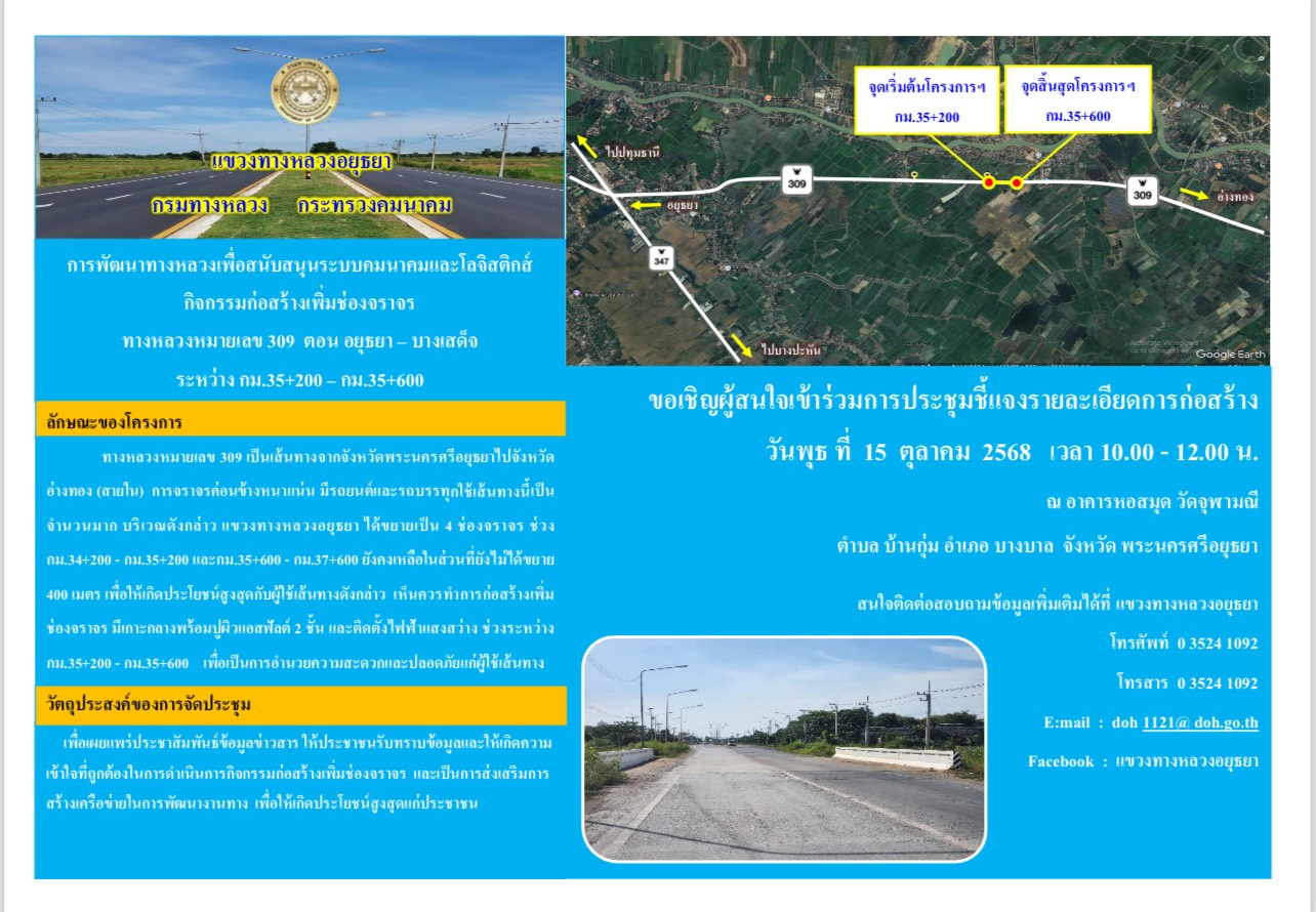 6 14/10/2568 การพัฒนาทางหลวงเพื่อสนับสนุนระบบคมนาคมและโลจิสติกส์กิจกรรมก่อสร้างเพิ่มช่องจราจร ทางหลวงหมายเลข 309 ตอน อยุธยา - บางเสด็จ