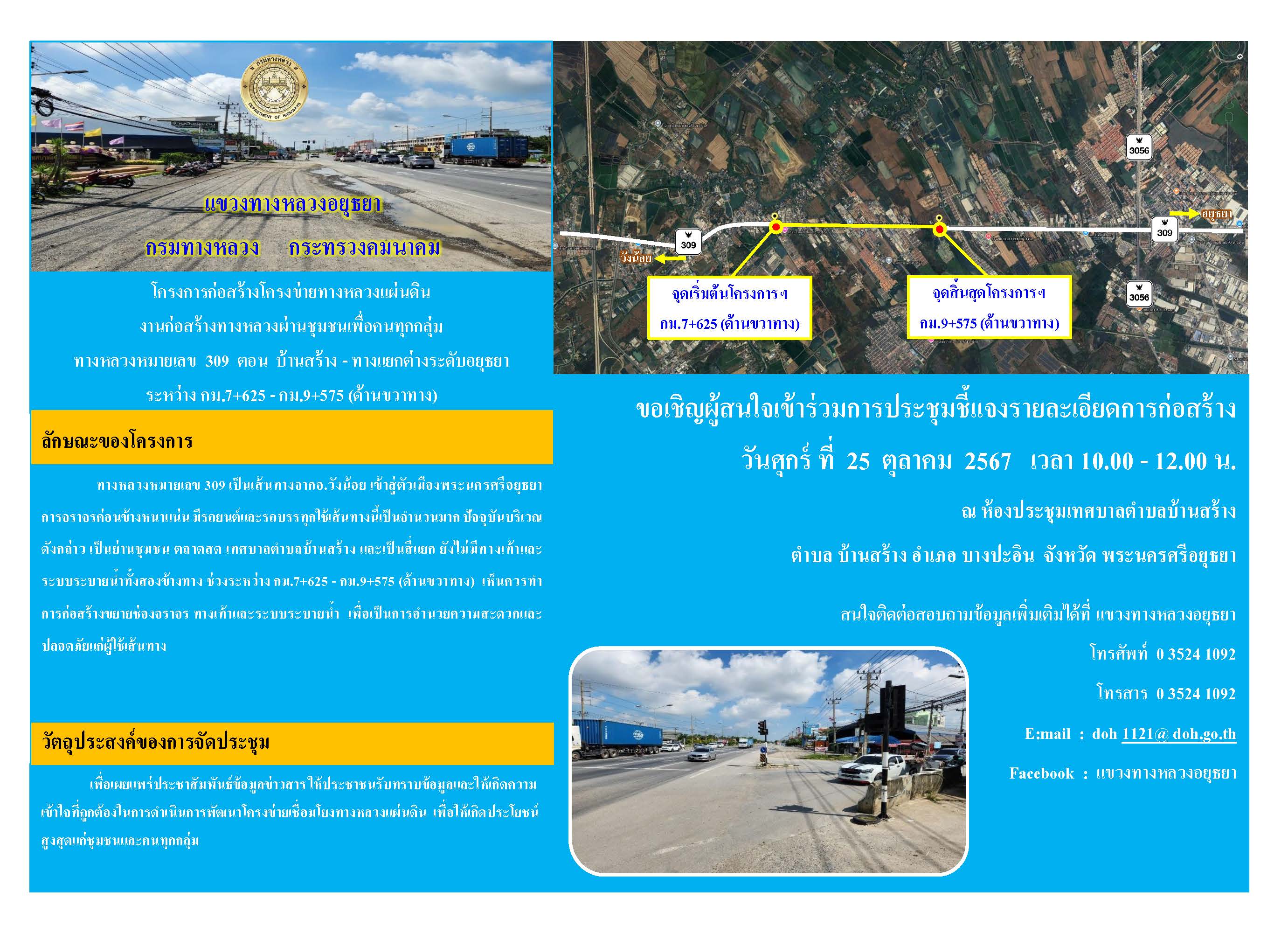 11 23/10/2567 โครงการก่อสร้างโครงข่ายทางหลวงแผ่นดิน งานก่อสร้างทางหลวงผ่านชุมชนเพื่อคนทุกกลุ่ม ทางหลวงหมายเลข 309 ตอน บ้านสร้าง - ทางแยกต่างระดบัอยุธยา ระหว่าง กม.7+625 -กม.9+575 (ด้านขวาทาง)