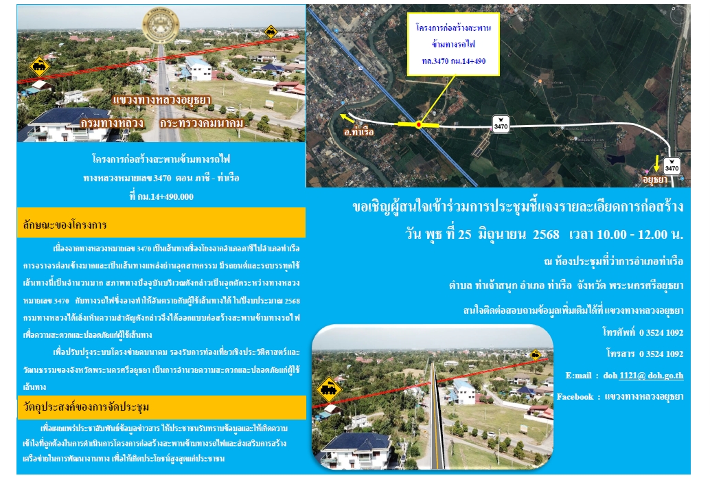 10 06/06/2568 โครงการก่อสร้างสะพานข้ามทางรถไฟบนทางหลวงหมายเลข 3470 สาย ภาชี - ท่าเรือ จังหวัดพระนครศรีอยุธยา ที่ กม.14+490