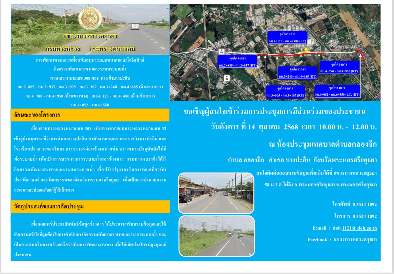 8 14/10/2568 การพัฒนาทางหลวงเพื่อสนับสนุนระบบคมนาคมและโลจิสติกส์กิจกรรมพัฒนาสะพานและระบบระบายน้ำทางหลวงหมายเลข 308 ตอน ทางเข้าบางปะอิน