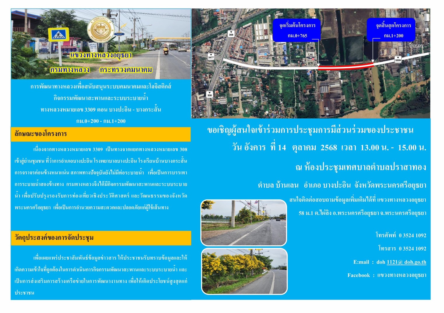 7 14/10/2568 การพัฒนาทางหลวงเพื่อสนับสนุนระบบคมนาคมและโลจิสติกส์กิจกรรมพัฒนาสะพานและระบบระบายน้ำทางหลวงหมายเลข 3309 ตอน บางปะอิน - บางกระสั้น