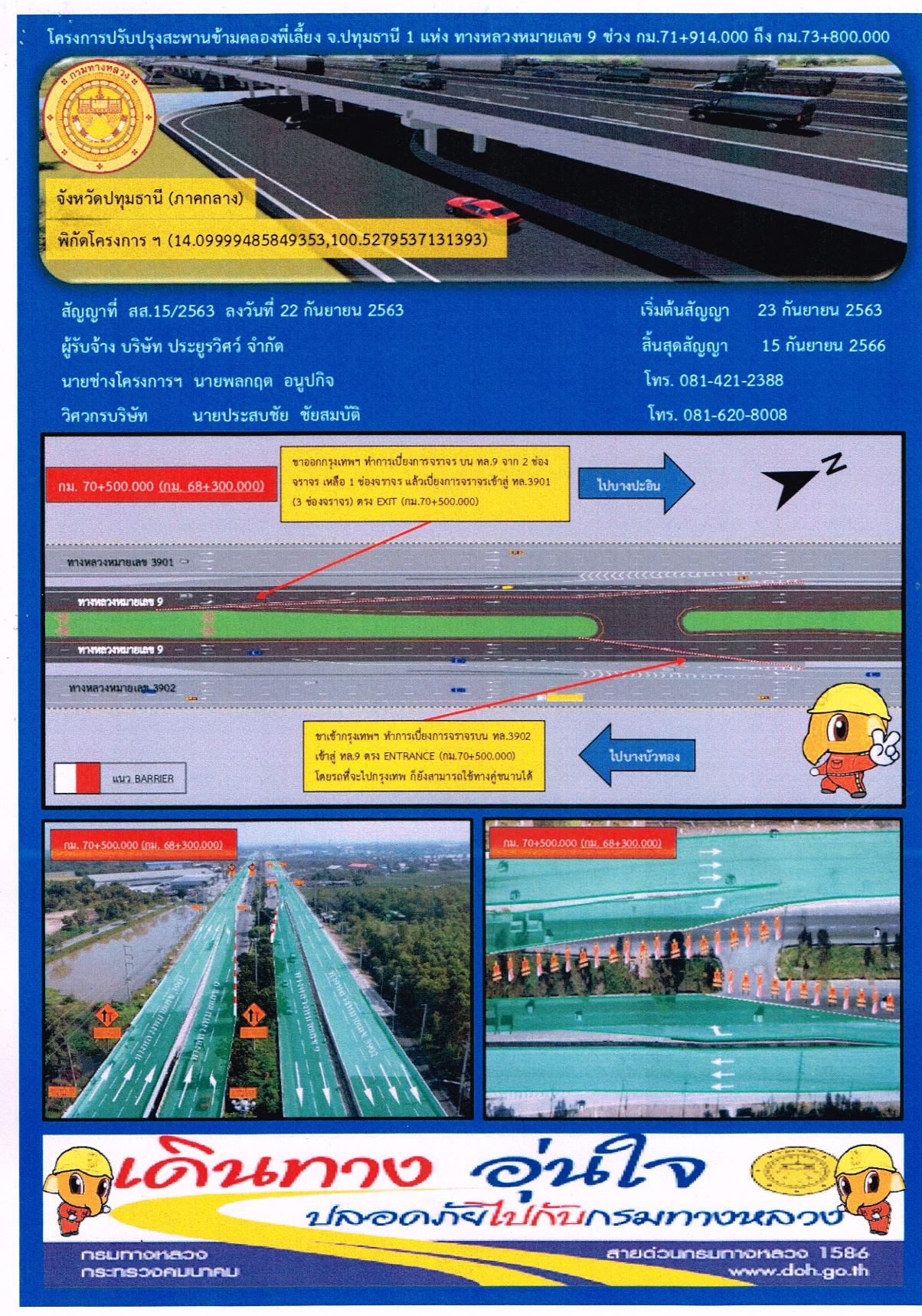 ขอเเจ้งประชาสัมพันธ์เบี่ยงการจราจรระหว่างการก่อสร้างสะพานข้ามคลองพี่เลี้ยง จ.ปทุมธานี ทางหลวงหมายเลข 9 (ถนนกาญจนาภิเษก) ฝั่งขาเข้าเเละขาออก บริเวณ กม.70+500.000 - กม.73+900.00