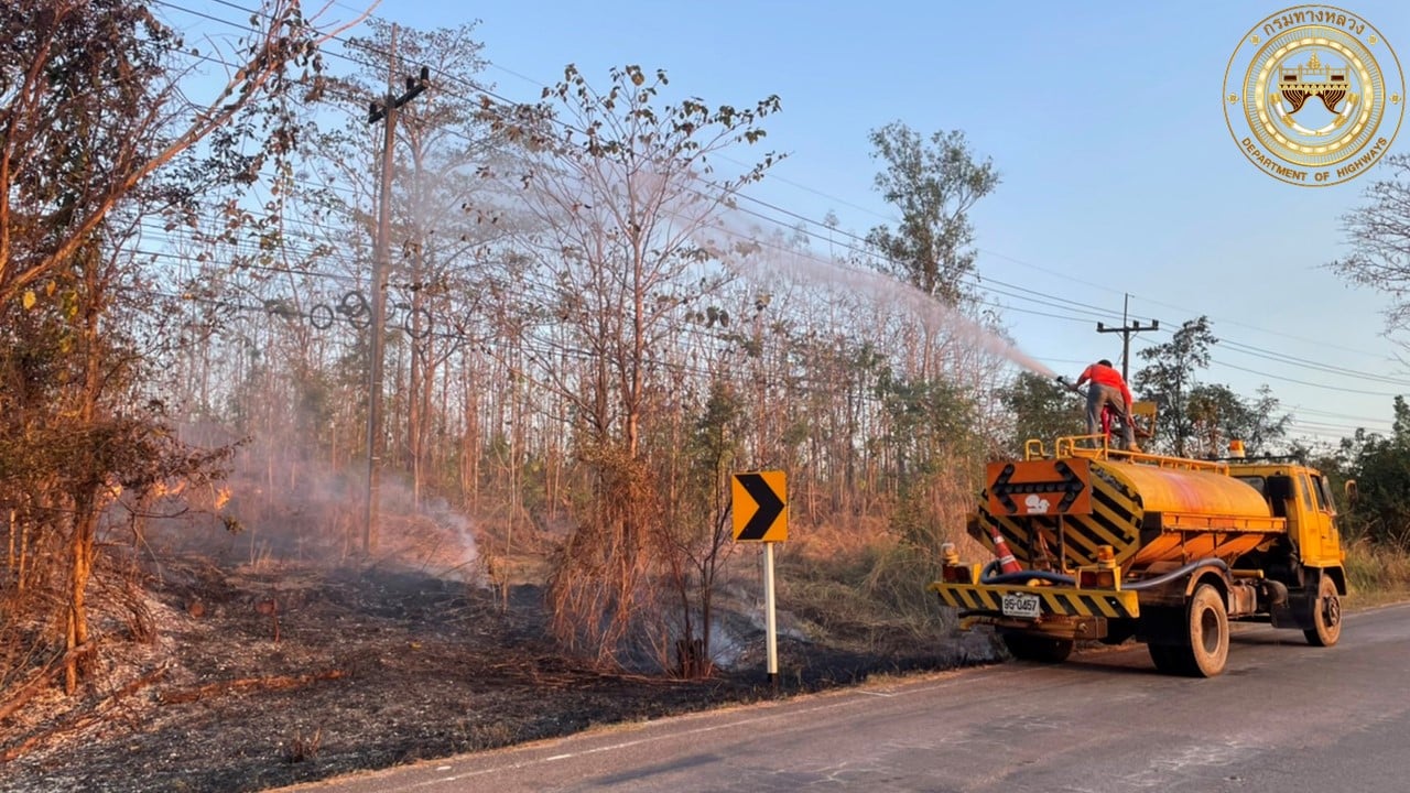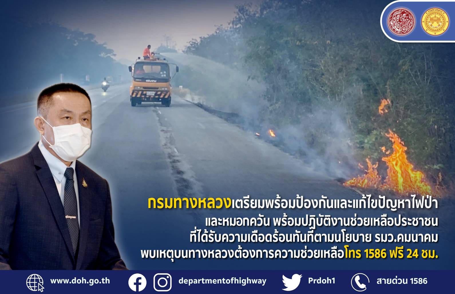 กรมทางหลวง เตรียมพร้อมป้องกันและแก้ไขปัญหาไฟป่าและหมวกควัน พร้อมปฏิบัติงานช่วยเหลือประชาชนที่ได้รับความเดือดร้อนทันทีตามนโยบาย รมว.คมนาคม พบเหตุบนทางหลวงต้องการความช่วยเหลือโทร 1586 ฟรี 24 ชม.