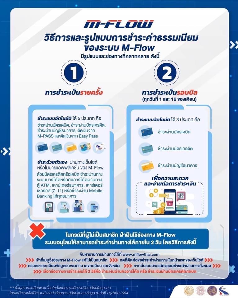 อธิบดีกรมทางหลวงเน้นย้ำว่า “ระบบ M-Flow คือ ระบบที่ใช้เทคโนโลยี AI ที่ทันสมัยที่สุดเป็นครั้งแรกในประเทศไทย ผู้ใช้ช่องทาง M-Flow นี้ เมื่อผ่านบริเวณด่านเก็บเงิน ไม่ต้องชะลอความเร็ว วิ่งผ่านด่านฯ ได้เลย โดยจะไม่มีไม้กั้นที่ช่องเก็บเงิน และเมื่อใช้งานผ่านด่านฯ แล้ว ค่อยจ่ายเงินภายหลัง ตามเงื่อนไขที่ลงทะเบียนสมัครสมาชิกไว้ สำหรับผู้ที่สามารถเข้ามาใช้ระบบ M-Flow ในช่องทางที่กําหนด ต้องเป็นผู้ที่ลงทะเบียนสมัครเป็นสมาชิก M-Flow เท่านั้น รถป้ายแดง รถป้ายเลอะเลือนไม่ชัดเจน หรือไม่ติดแผ่นป้ายทะเบียน ห้ามเข้ามาใช้ระบบ M-Flow จึงขอเชิญชวนให้รีบสมัครเป็นสมาชิกตามช่องทางต่างๆ ข้างต้นให้เรียบร้อยก่อน เมื่อสมัครเสร็จแล้ว ก็สามารถเข้าใช้บริการได้ทันทีในทุกด่านฯ โดยใช้ช่องทางขวาสุด สังเกตป้ายสัญลักษณ์ M-Flow ก่อนถึงด่านฯ และที่พื้นถนน ส่วนรถยนต์ที่ยังไม่ได้เป็นสมัครสมาชิก หากขับผ่านช่อง M-Flow เนื่องจากเกิดความสับสนช่องทางวิ่งหรือไม่ทันสังเกตป้ายเตือนต่างๆ ขอให้ท่านรีบดำเนินการชําระเงินย้อนหลังภายใน 2 วัน โดยสามารถตรวจสอบยอดค้างชำระและชำระเงินได้ 3 ช่องทาง ได้แก่ เวบไซต์ mflowthai.com, Mobile Application: MFlowThai และ Line OA: @mflowthai เพื่อแสดงว่าท่านไม่มีเจตนาหลีกเลี่ยงไม่ชำระค่าผ่านทาง หากไม่ชำระตามเวลาที่กำหนดจะถูกดำเนินคดีตามกฎหมาย ทั้งนี้ สําหรับรถยนต์ป้ายแดง หรือป้ายทะเบียนไม่ชัดเจน ไม่สามารถใช้บริการ M-Flow ได้ แต่ยังคงใช้ช่องชําระเงินสด และช่อง M-Pass Easy Pass ได้ หากสงสัยหรือต้องการสอบถามข้อมูลเพิ่มเติม โทรติดต่อได้ที่ Call Center โทร 1586 กด 1