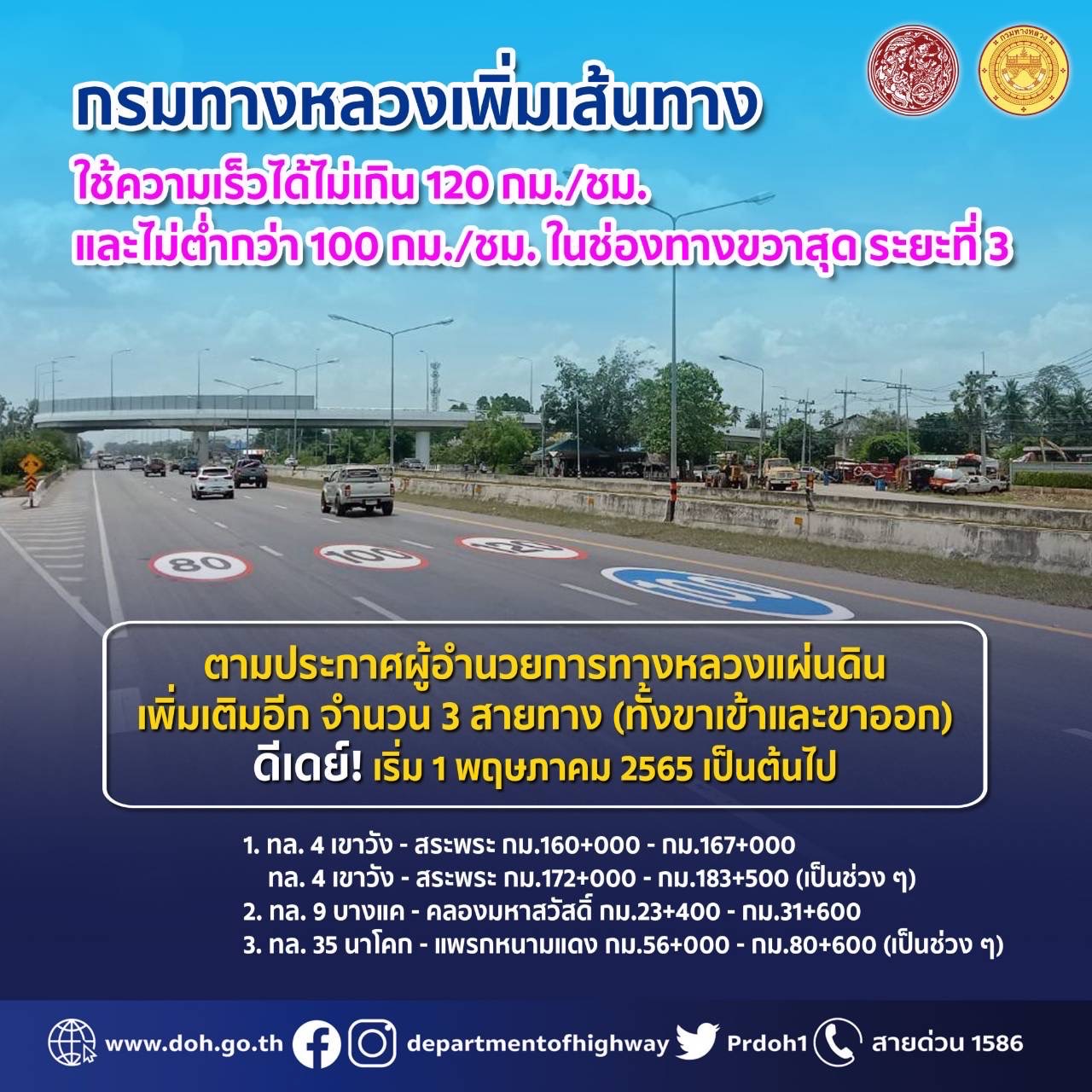 ดีเดย์! กรมทางหลวง เพิ่มเส้นทางให้รถวิ่งได้ไม่เกิน 120 กม./ชม. ระยะที่ 3 เพิ่มอีก 3 เส้นทาง เริ่ม 1 พฤษภาคม 2565 นี้