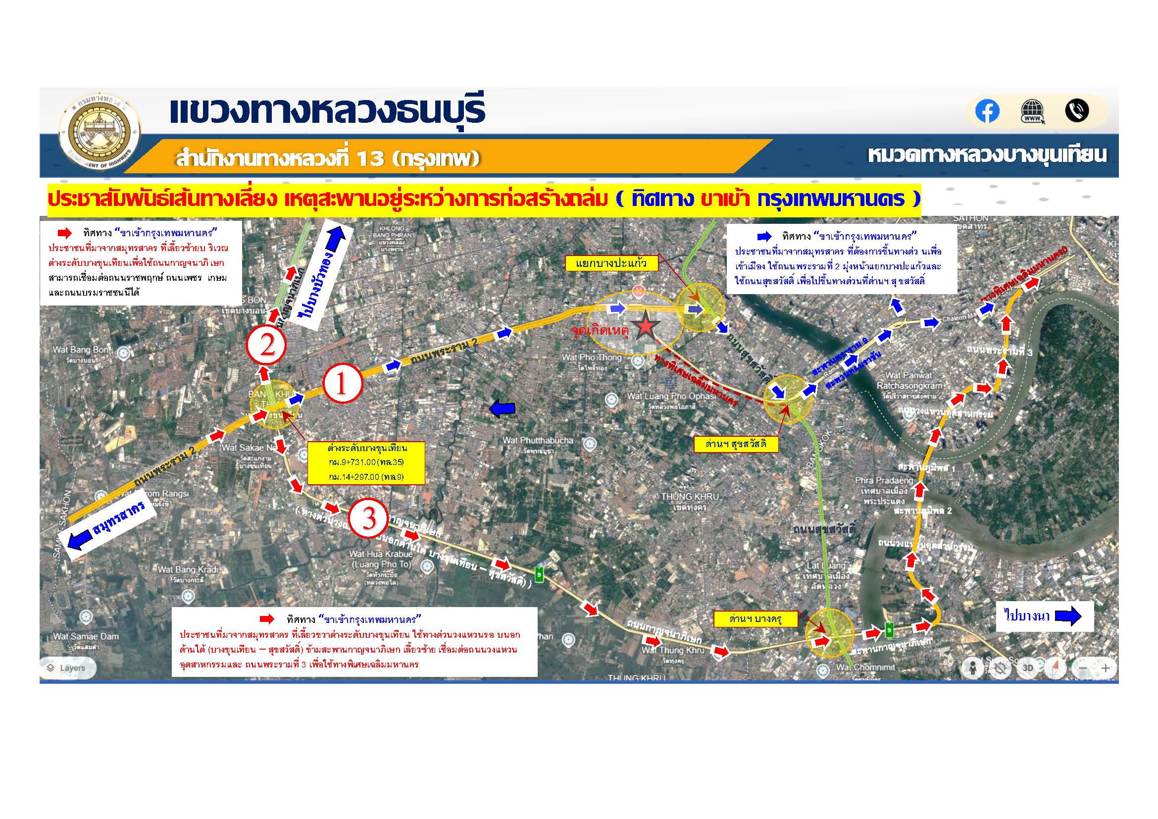 กรมทางหลวง โดย แขวงทางหลวงธนบุรี แจ้งประชาสัมพันธ์เส้นทางเลี่ยง เหตุโครงสร้างที่อยู่ระหว่างการก่อสร้างเกิดการทรุดตัว บริเวณหน้าด่านฯดาวคะนอง พื้นที่การก่อสร้างโครงการทางพิเศษสายพระราม 3 - ดาวคะนอง - วงแหวนรอบนอกกรุงเทพมหานครด้านตะวันตก สัญญาที่ 3