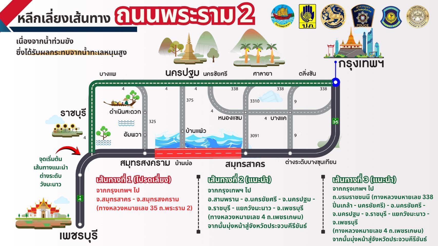เนื่องจากขณะนี้เกิดสถานการณ์น้ำทะเลหนุนสูงกว่าปกติ บริเวณถนนพระราม 2 ทำให้มีน้ำท่วมขังผิวจราจร ช่วง แยกบ้านแพ้ว ถึงหน้าดูโฮม (กม.38+000 - กม.39+000) ฝั่งขาเข้า และขาออก หน้า ร.ร. สารสาสน์