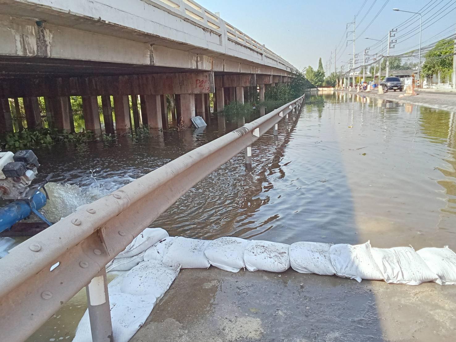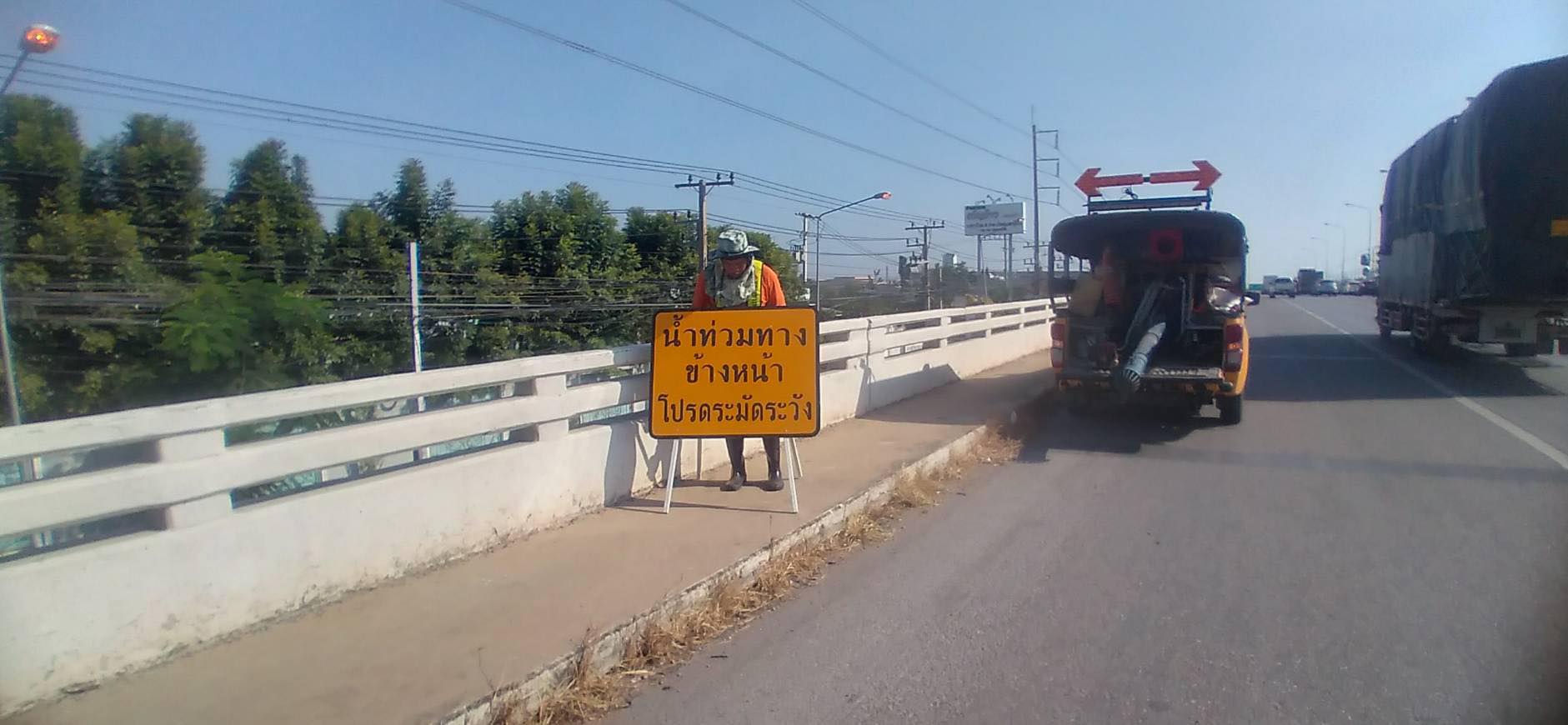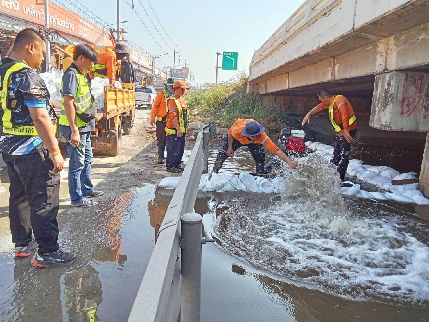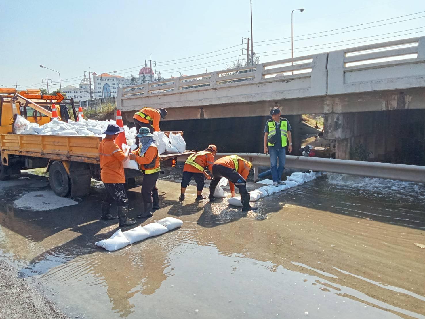 เจ้าหน้าที่กรมทางหลวง โดยแขวงทางหลวงสมุทรสาคร ติดตั้งป้าย เร่งดำเนินการวางกระสอบทรายทำเป็นคันกั้นน้ำ และติดตั้งเครื่องสูบน้ำ เพื่อดึงน้ำออกจากผิวจราจรอย่างเต็มที่