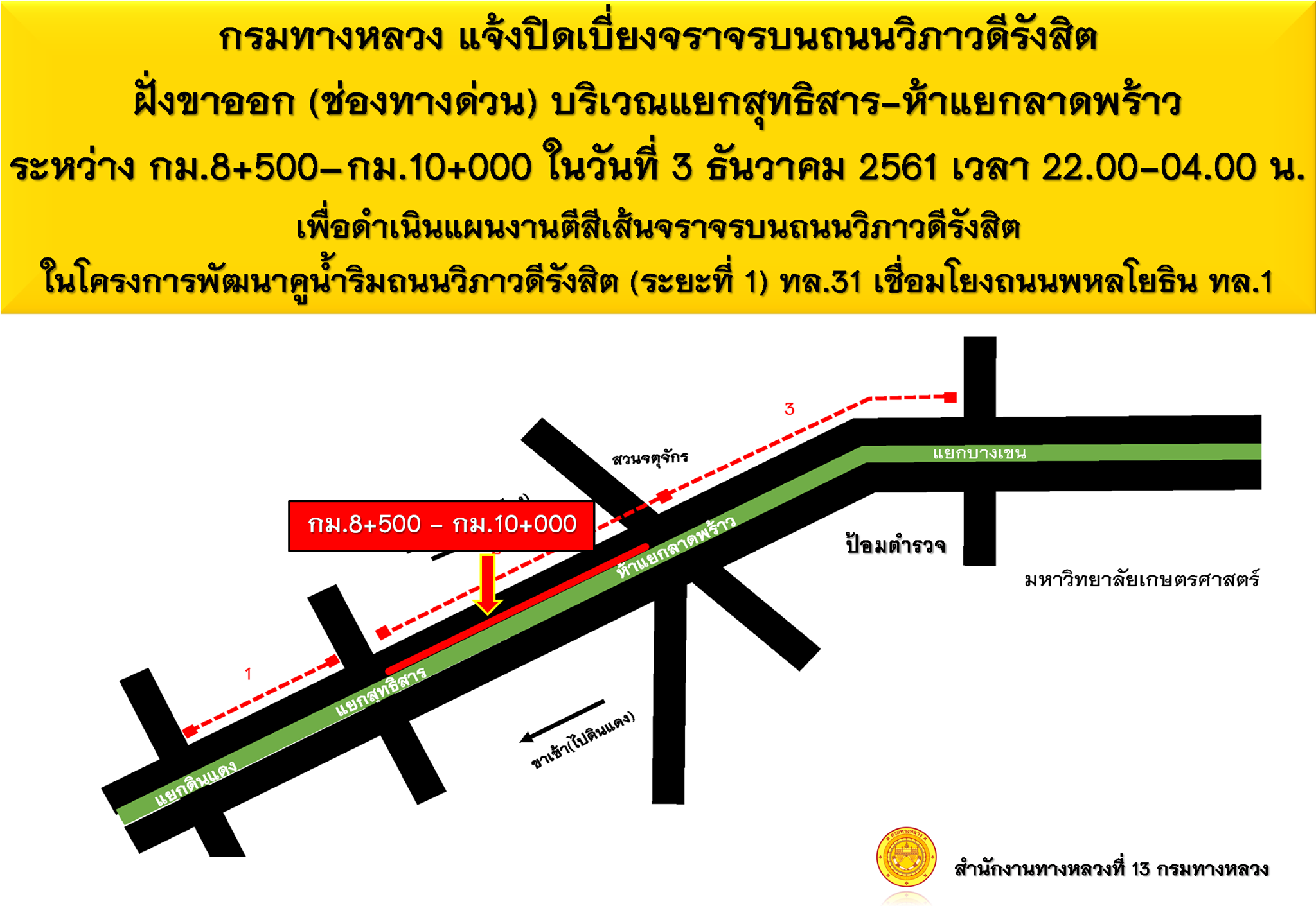 กรมทางหลวง โดย สำนักงานทางหลวงที่ 13 แจ้งปิดการจราจรบนถนนวิภาวดีรังสิต (ช่องทางด่วนขาออก) บริเวณห้าแยกลาดพร้าว ระหว่าง กม.11+200 - กม.12+000 เลนที่ 2 (เลนกลาง) ในวันที่ 4 ธันวาคม 2561 เวลา 22.00 - 04.00 น. เพื่อดำเนินงานปรับปรุงผิวจราจรโดยการลาดยาง จึงมีความจำเป็นต้องปิดการจราจรชั่วคราวในจุดดังกล่าว โดยใช้ทางคู่ขนานแทน ระหว่างดำเนินการอาจทำให้การจราจรติดขัด ไม่สะดวกแก่ผู้ใช้รถใช้ถนนและประชาชนทั่วไป กรมทางหลวงต้องขออภัยมา ณ โอกาสนี้