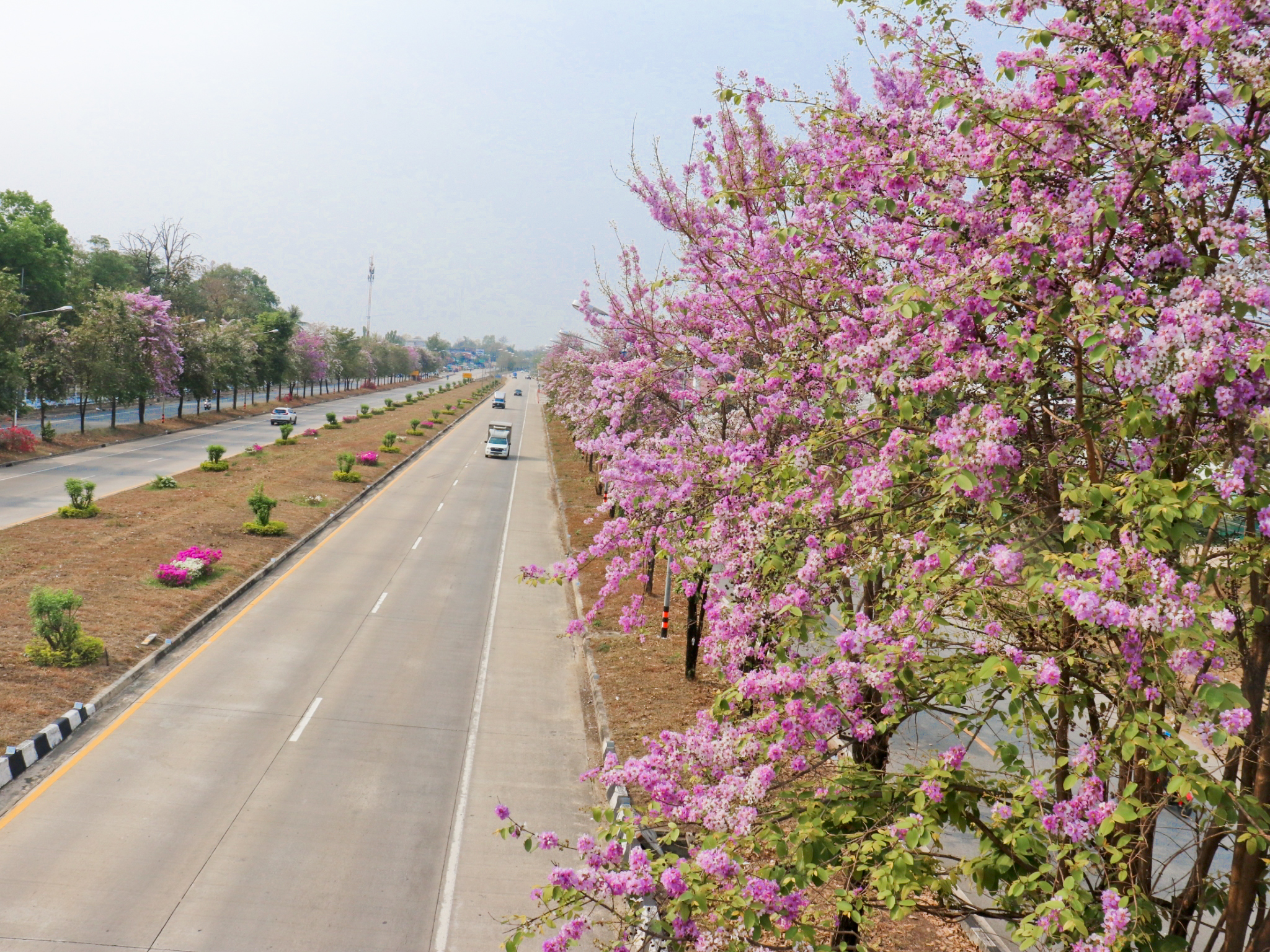 สำหรับต้นตะแบกเป็นไม้ยืนต้นกึ่งผลัดใบขนาดกลางถึงขนาดใหญ่ มีความสูงได้ประมาณ 15 - 35 เมตร เรือนยอดเป็นรูปเจดีย์ต่ำ ๆ แตกกิ่งก้านสาขาออกรอบต้น เกลี้ยงดอกออกเป็นช่อที่ปลายกิ่งโค้งชูเหนือเรือนยอด ดอกบานวันแรกสีม่วงอมชมพู ต่อมาเปลี่ยนเป็นสีขาว ทนแล้ง นิยมปลูกริมถนนทางเดิน ทั้งนี้ กรมทางหลวงขอความร่วมมือประชาชนโปรดจอดรถบริเวณสองข้างทางอย่างระมัดระวังระหว่างทำการถ่ายภาพ เพื่อป้องกันปัญหาการจราจรติดขัดและอุบัติเหตุที่อาจเกิดขึ้น รวมถึงไม่เป็นการกีดขวางการจราจรบนทางหลวง เดินทางอย่างปลอดภัย และใส่ใจสิ่งแวดล้อม ปฏิบัติตาม "ชีวิตวิถีใหม่ ขับขี่อย่างปลอดภัย ไร้อุบัติเหตุ" เพื่อความสะดวกปลอดภัยของผู้ร่วมทาง หากต้องการสอบถามสภาพเส้นทาง สภาพการจราจรหรือขอความช่วยเหลือต่างๆ สามารถติดต่อได้ที่ สายด่วนกรมทางหลวง 1586 โทรฟรี ทุกเครือข่ายตลอด 24 ชม.