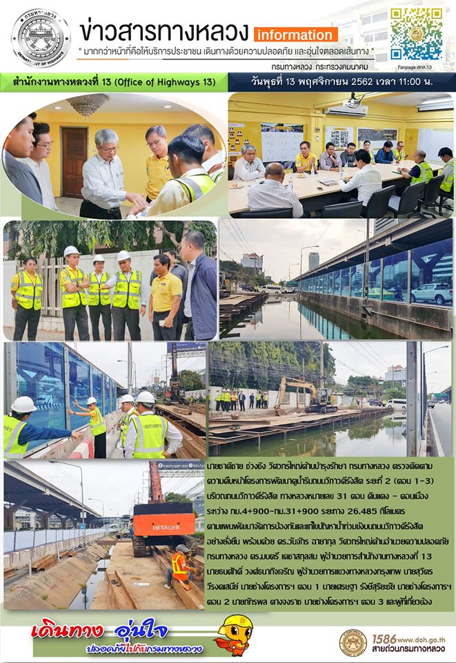 วันพุธที่ 13 พฤศจิกายน 2562 เวลา 11.00 น. นายชาติชาย ช่วงชิง วิศวกรใหญ่ด้านบำรุงรักษา กรมทางหลวง ตรวจติดตามความคืบหน้าโครงการพัฒนาคูน้ำริมถนนวิภาวดีรังสิต ระยะที่ 2 (ตอน 1 - 3) บริเวณถนนวิภาวดีรังสิต ทางหลวงแผ่นดินหมายเลข 31 ตอน ดินแดง - ดอนเมือง ระหว่าง กม.4+900 - กม.31+900 ระยะทาง 26.485 กิโลเมตร ตามแผนพัฒนาจัดการป้องกันและแก้ไขปัญหาน้ำท่วมขังบนถนนวิภาวดีรังสิตอย่างยั่งยืน พร้อมด้วย ดร.วันจักร ฉายากุล วิศวกรใหญ่ด้านอำนวยความปลอดภัย กรมทางหลวง ดร.มนตรี เดชาสกุลสม ผู้อำนวยการสำนักงานทางหลวงที่ 13 นายธนศักดิ์ วงศ์ธนากิจเจริญ ผู้อำนวยการแขวงทางหลวงกรุงเทพ นายสุวิตร วีรงคเสนีย์ นายช่างโครงการฯ ตอน 1 นายเศรษฐา รังษีสุริยะชัย นายช่างโครงการฯ ตอน 2 นายภัทรพล ตางจงราช นายช่างโครงการฯ ตอน 3 และผู้ที่เกี่ยวข้อง #กรมทางหลวง #สายด่วนกรมทางหลวง1586