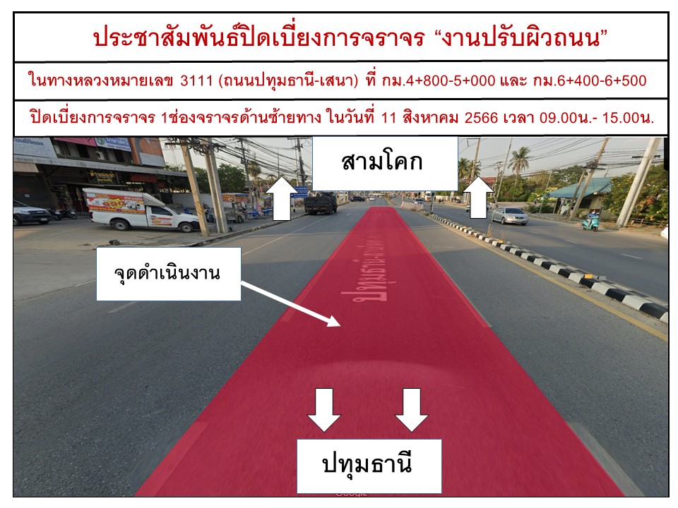 แจ้งประชาสัมพันธ์ ปิดเบี่ยงการจราจร ถนนปทุมธานี-เสนา (ด้านขาเข้า) ซ้ายทาง ช่วง สามโคก - แยกปทุมเฉลิมพระเกียรติ(แยกสันติสุข) ที่ กม.4+800 - 5+000 และ กม.6+400 - 6+500 เพื่อปรับผิวการจราจร
