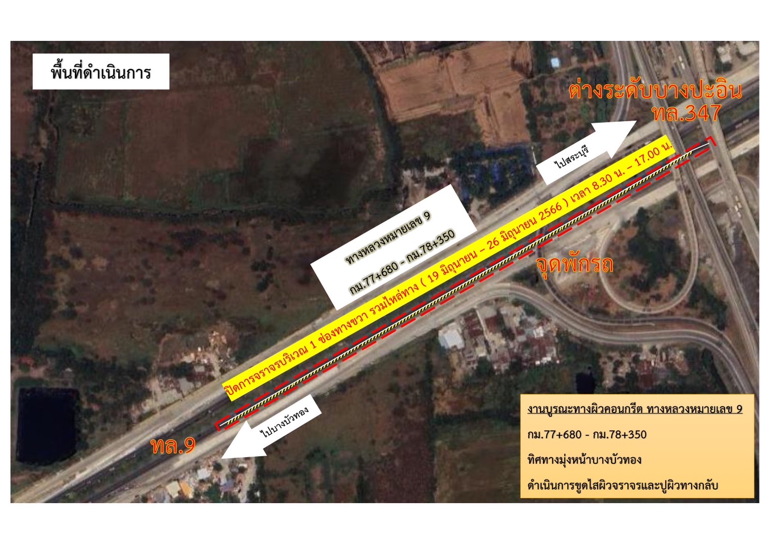 ประกาศแขวงทางหลวงปทุมธานี ดำเนินการปิดถนน 1 ช่องทางซ้ายรวมไหล่ทาง เพื่อบูรณะทางผิวคอนกรีตบนทางหลวงหมายเลข 9 กม.77+680 - กม.78+350 ฝั่งทางขวามุ่งหน้า (RT) มุ่งหน้าบางบัวทอง วันที่ 19 - 26 มิถุนายน 2566 เวลา 08.30 น. - 17.00 น.