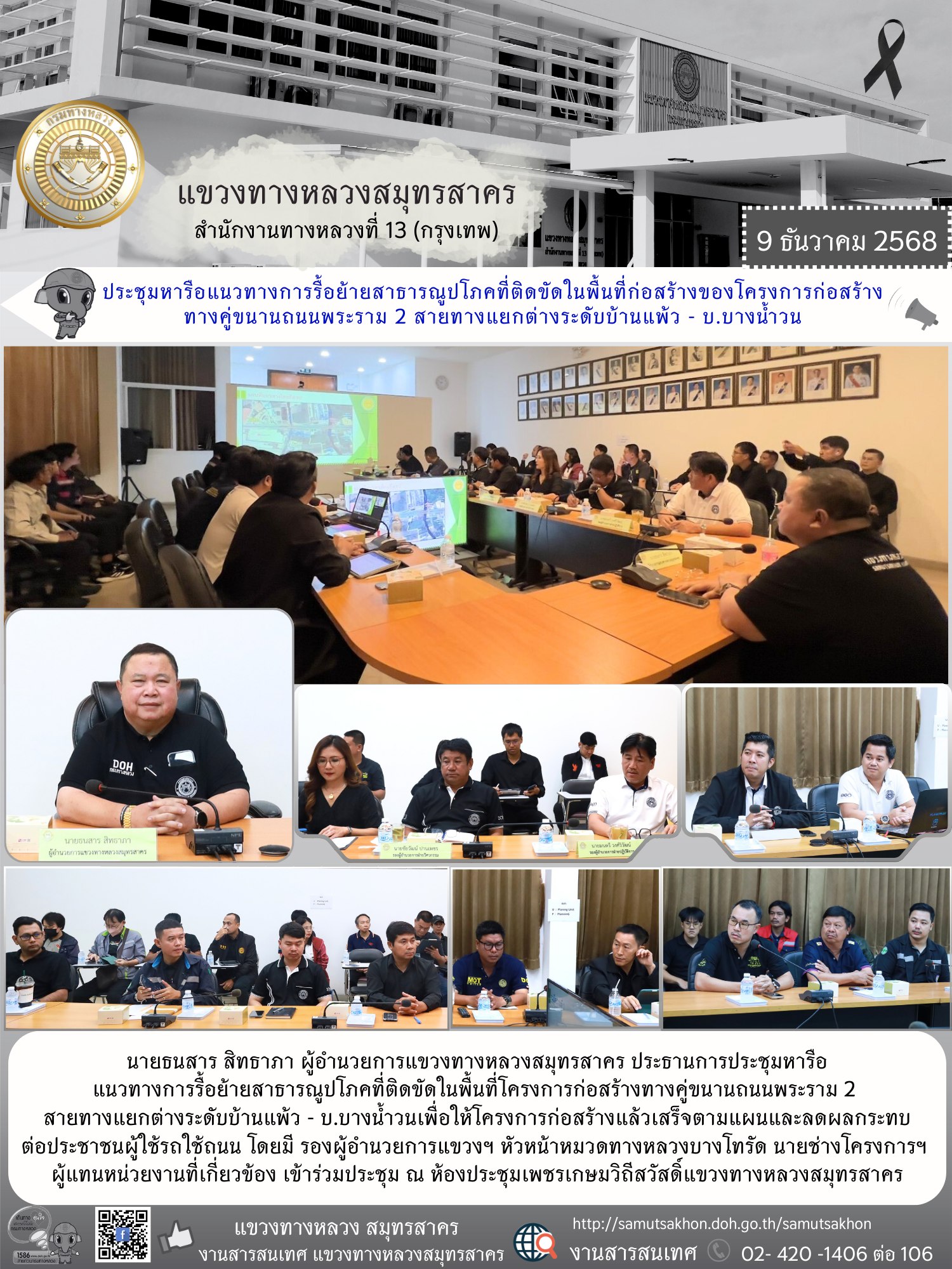 ประชุมหารือแนวทางการรื้อย้ายสาธารณูปโภคที่ติดขัดในพื้นที่โครงการก่อสร้างทางคู่ขนานถนนพระราม 2 สายทางแยกต่างระดับบ้านแพ้ว - บ.บางน้ำวน